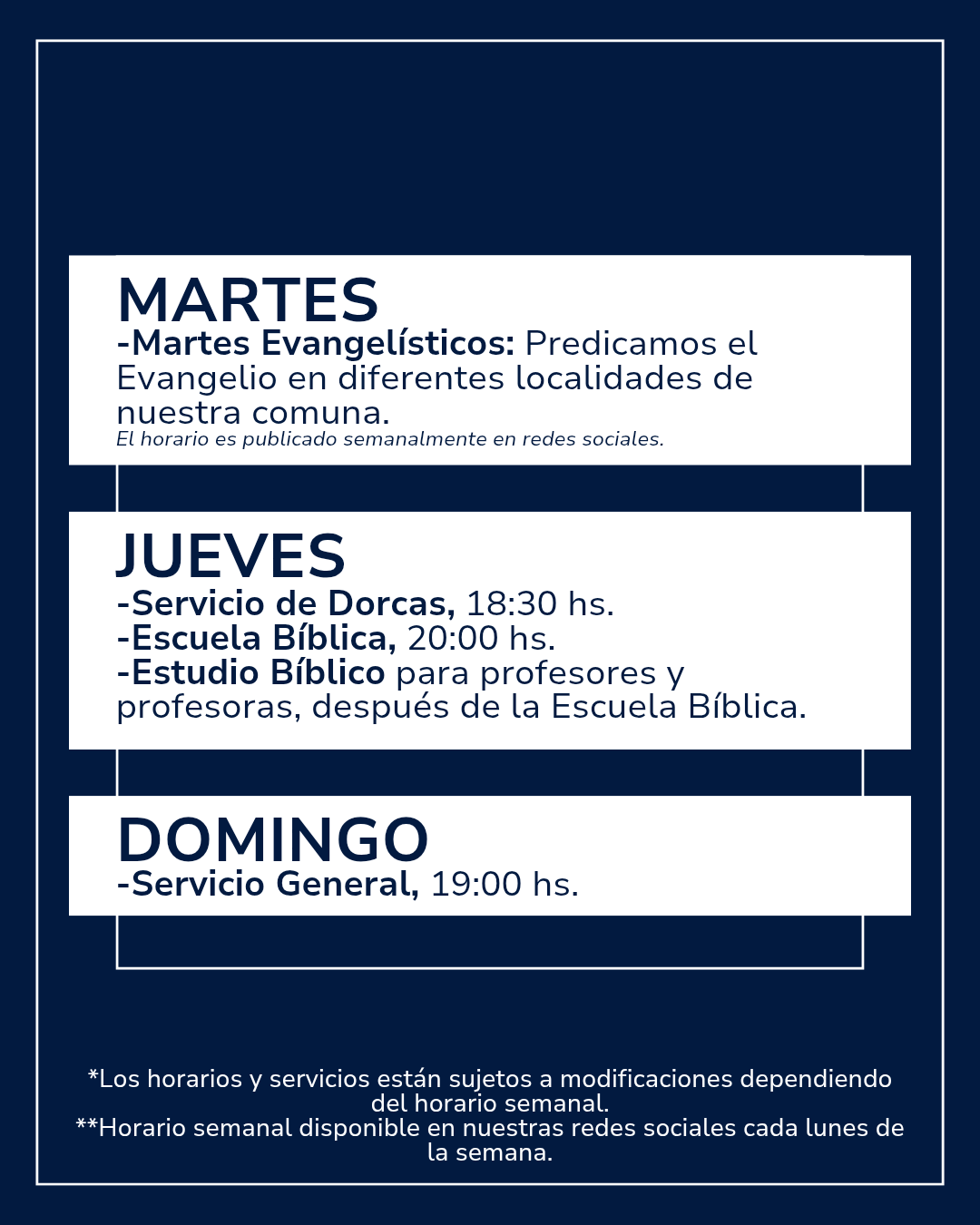 BIENVENIDOS Lo Ultimo Ubicación Videos ¡Mira más videos de alabanzas y transmisiones en vivo en nuestro YouTube! Horarios Desde 1910 amando, sirviendo y adorando. Nuestras Redes Sociales SeguirSeguirSeguir